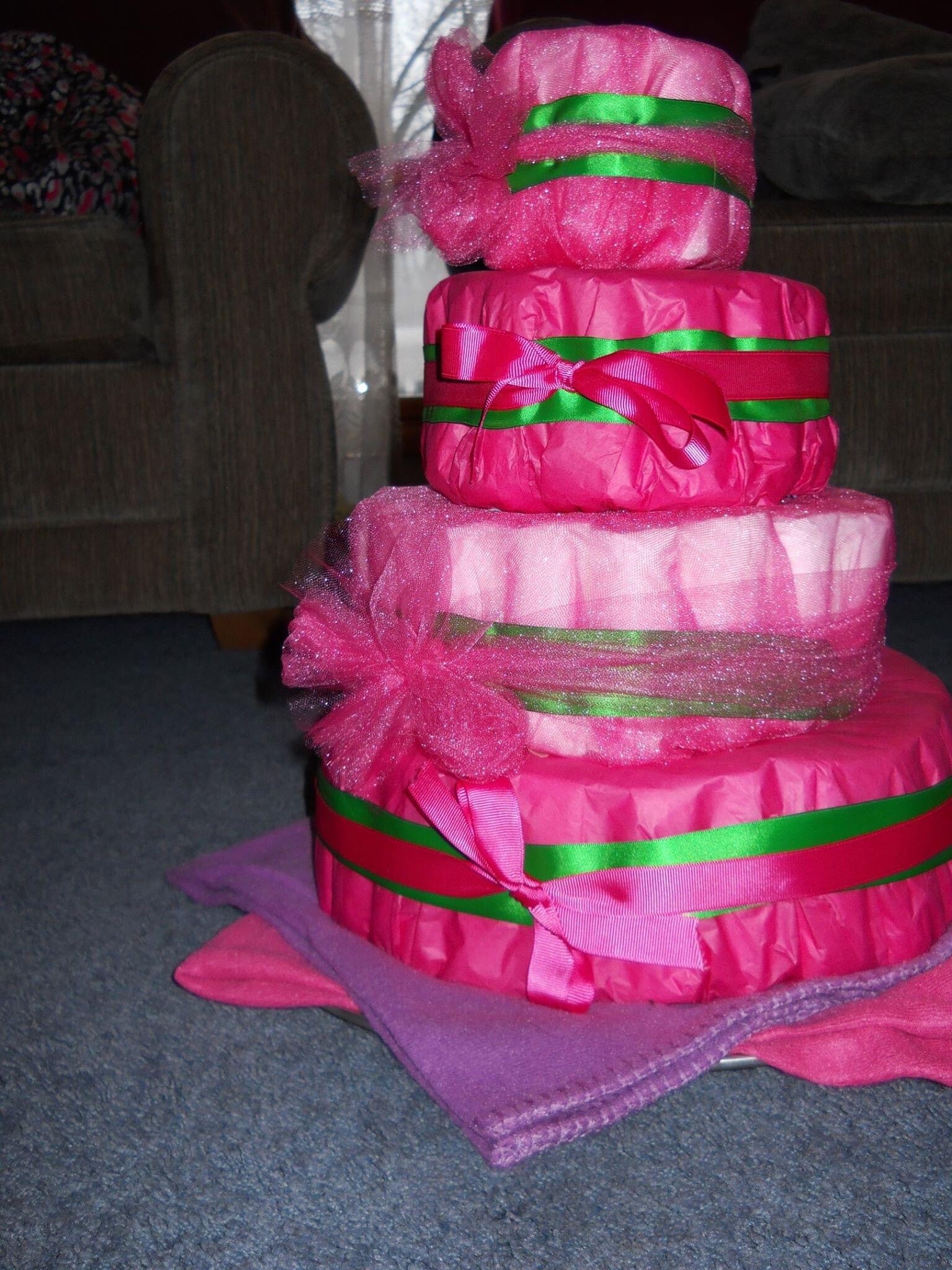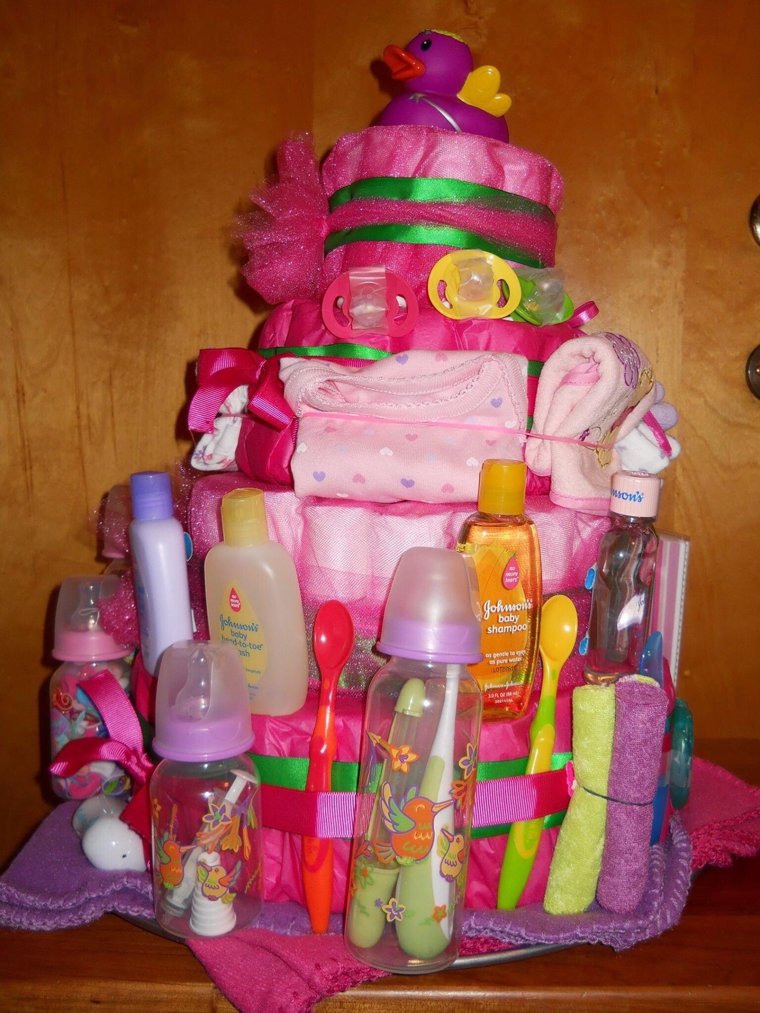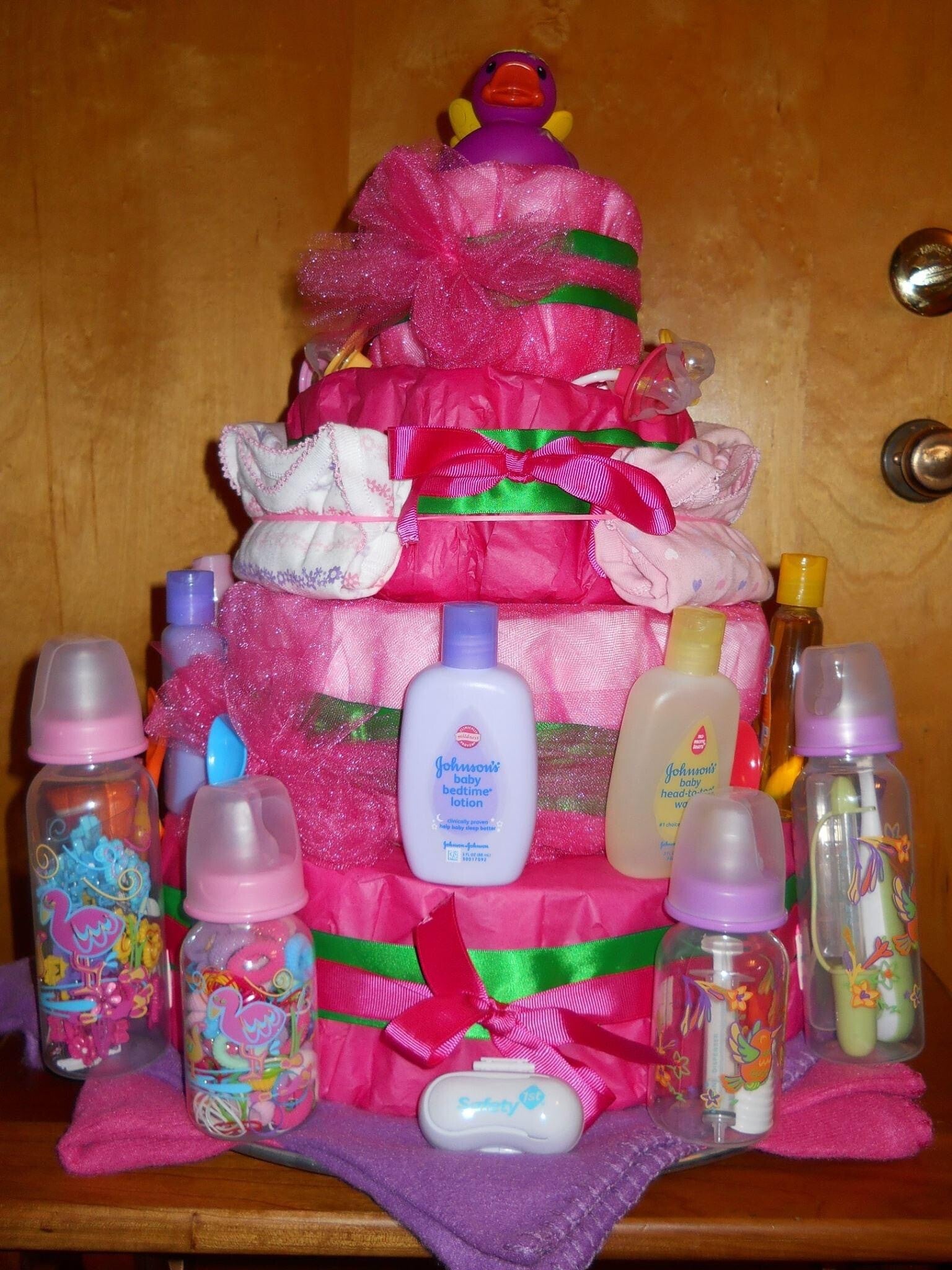 One layer of diapers made to order including baby bottles in the center as well as a stuffed animal on top and any number of the following items: pacifiers, washcloths, bibs, rash cream, small toys, socks, hat, onesies, etc.