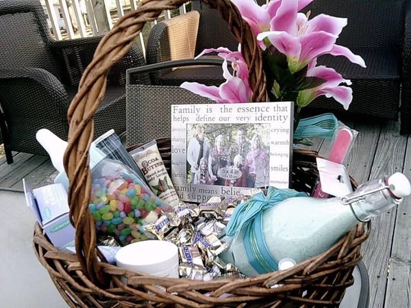 Includes candy, body products, bath products, picture frame, and a beautiful basket.